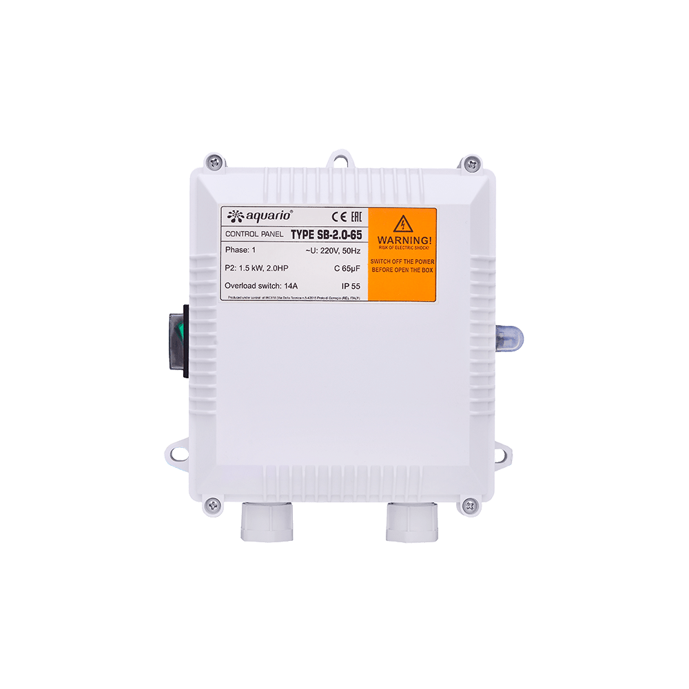 тип: пусковой блок; класс защиты: IP55, максимальная мощность насоса 1500 Вт, емкость конденсатора: 65мкФ, номинал защитного автоматического выключателя: 14А