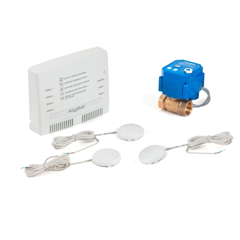 Контроллер защиты от протечек воды AquaBast C-RF, 1 шаровой кран с электроприводом, 12 В, 3/4 дюйма, корпус латунь литье, ручное открытие / закрытие, индикатор положения крана, 3 проводных датчика протечки, 1 блок питания на 5В, контроль датчиков протечки, управление одной кнопкой, светодиодная индикация режимов работы и зон протечки, энергосберегающий режим при работе от АКБ, звуковое и световое оповещение